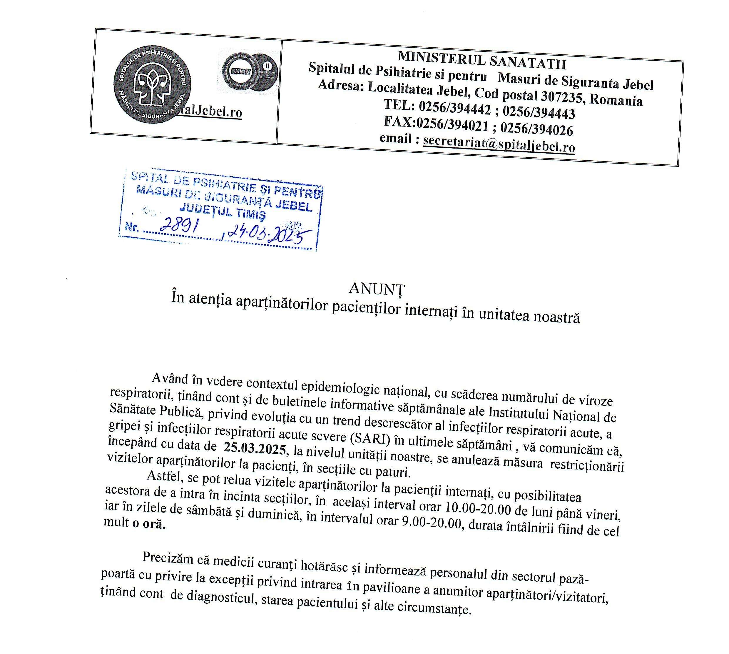 Anunțuri de interes public Anunț restricție vizite aparținători - 09.09.2025 Anunț restricție vizite aparținători – 09.09.2025 Anunț anulare carantina gripa - 25.03.2025 Anunț anulare carantina gripa – 25.03.2025 Anunț restrictie vizite aparținători - 28.01.2025 Anunț restrictie vizite aparținători – 28.01.2025