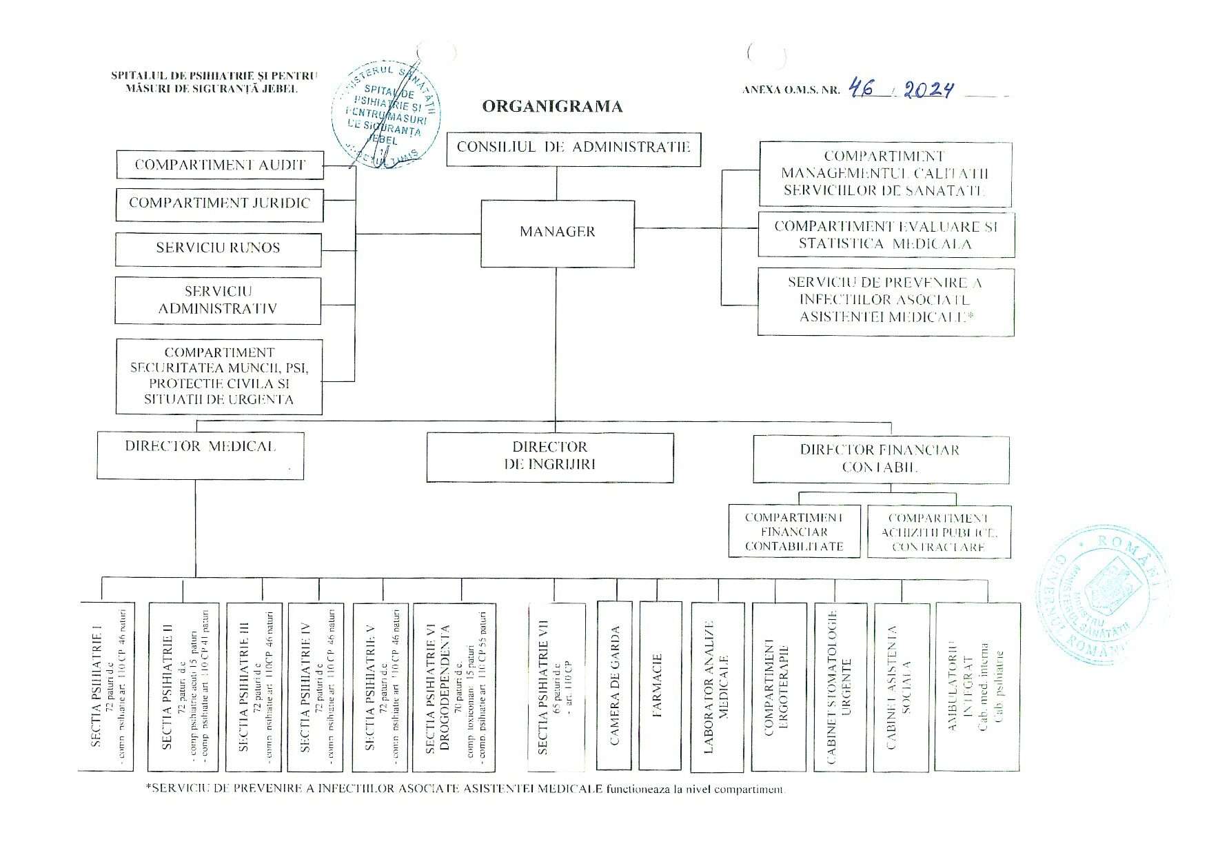 Structura organizatorica cf. Ordinului 585 din 2019, Ordinul numărul 3766/13.12.2022 pentru modificarea Ordinului 585/2019 privind aprobarea structurii organizatorice a Spitalului de Psihiatrie și pentru Măsuri de Siguranță Jebel
